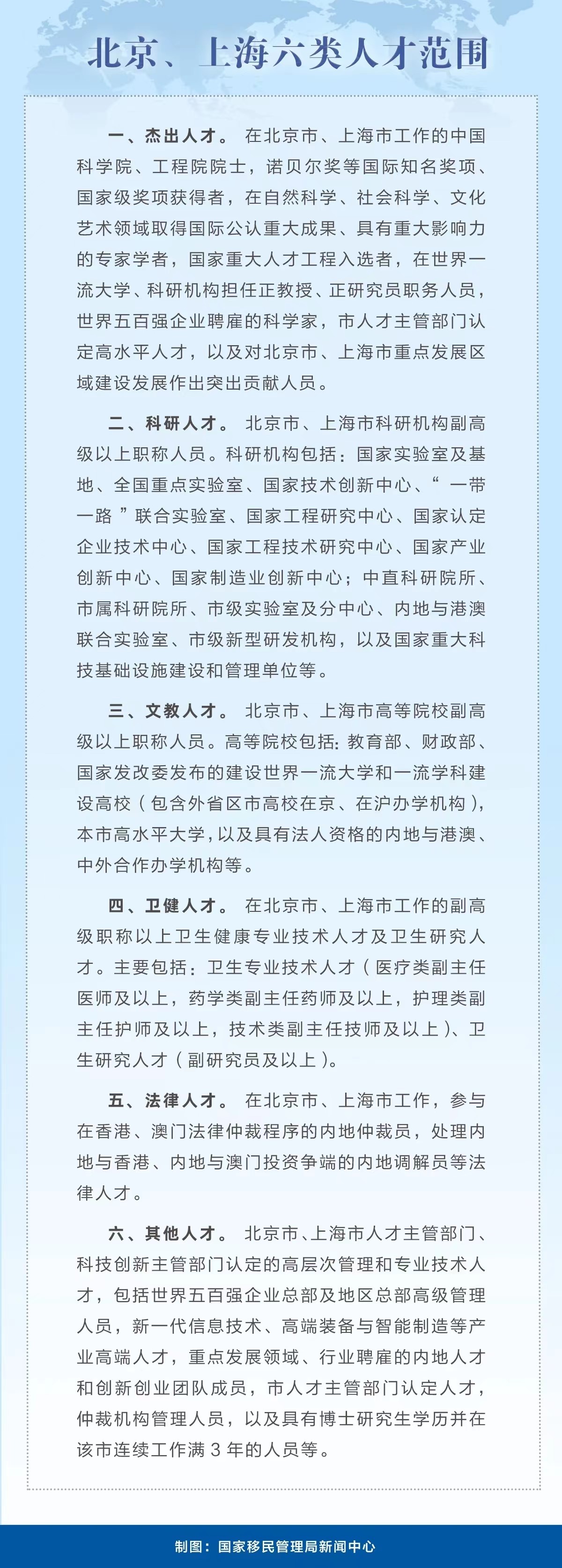 三、北京、上海六类人才可以申办赴港澳人才签注。将赴港澳人才签注政策由粤港澳大湾区内地城市扩大至北京、上海。在北京、上海工作的杰出人才、科研人才、文教人才、卫健人才、法律人才以及管理人才等六类人才,可以凭有关人才证明,单独或者同时申请办理有效期1至5年不等的多次赴香港和赴澳门人才签注,每次在香港或者澳门停留不超过30天。