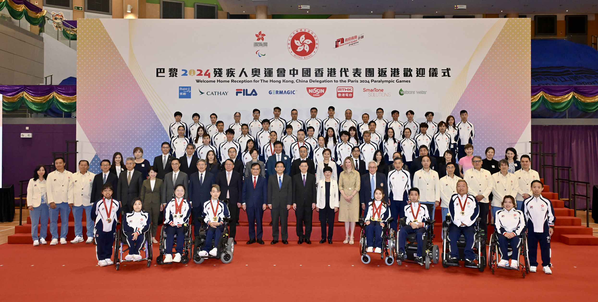 本网讯 9月16日上午,巴黎2024残疾人奥运会中国香港代表团返港欢迎仪式在马鞍山体育馆举行。香港特区行政长官李家超、特区政府政务司司长陈国基、中央政府驻港联络办秘书长王松苗、外交部驻港公署副特派员方建明、中国香港残疾人奥委会会长冯马洁娴等嘉宾出席。