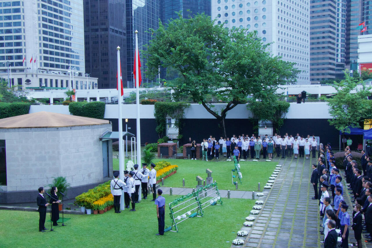 当日上午,纪念仪式在香港大会堂纪念花园举行。警察银乐队奏中华人民共和国国歌,全体出席人员默哀两分钟,香港警察步枪仪仗队鸣枪致敬。香港特区行政长官李家超代表特区政府敬献花圈并鞠躬,向为保卫香港而捐躯的人士致敬。中央政府驻港联络办秘书长王松苗、驻港国安公署副署长陈枫、外交部驻港特派员公署副特派员李永胜、解放军驻港部队副政委王兆兵及各界代表随后分别上前敬献花圈并致敬。