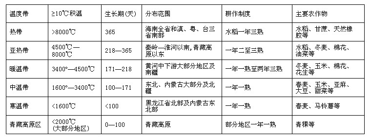 ???? 中国采用积温来划分温度带,当日平均气温稳定升到10℃以上时,大多数农作物才能活跃生长,所以通常把日平均气温连续≥10℃的天数叫生长期。把生长期内每天平均气温累加起来的温度总和叫积温。一个地区的积温,反映了该地区的热量状况。根据积温的分布,中国划分了5个温度带和一个特殊的青藏高原区。不同的温度带内热量不同,生长期长短不一,耕作制度和作物种类也有明显差别。